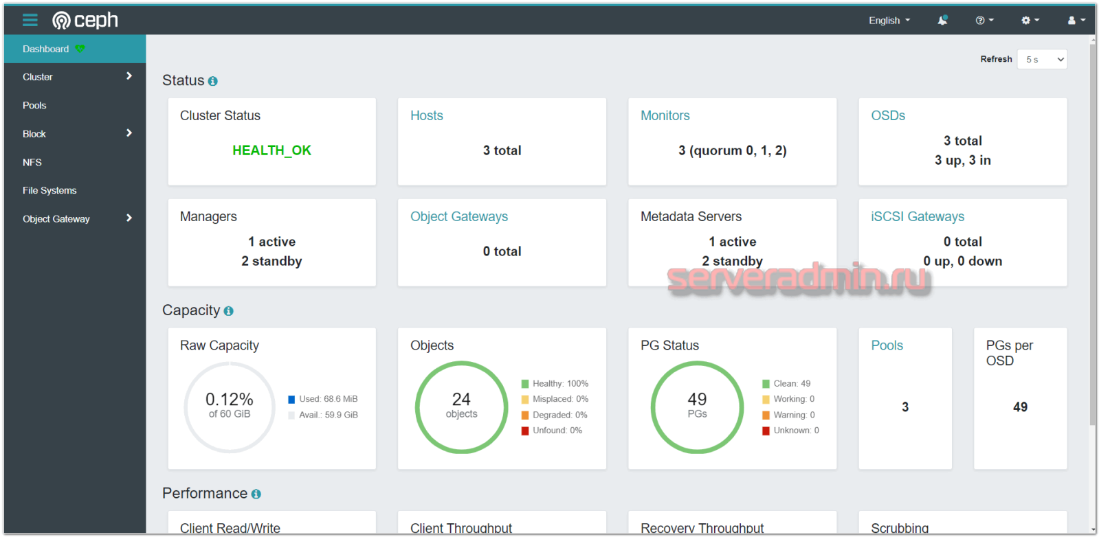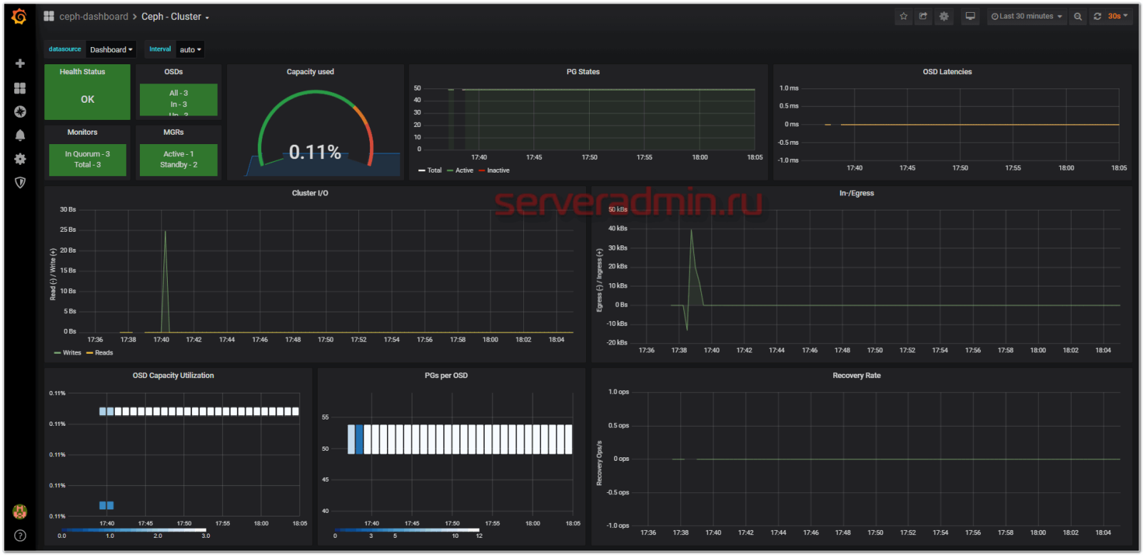 - MGR, Manager Daemon — сервис мониторинга. До релиза Luminous был не обязательным компонентом, теперь — неотъемлемая часть кластера. Демон обеспечивает различный мониторинг кластера — от собственного дашборда до выгрузки метрик через json. Очень удобно. Мониторинг кластера не представляет особых сложностей.