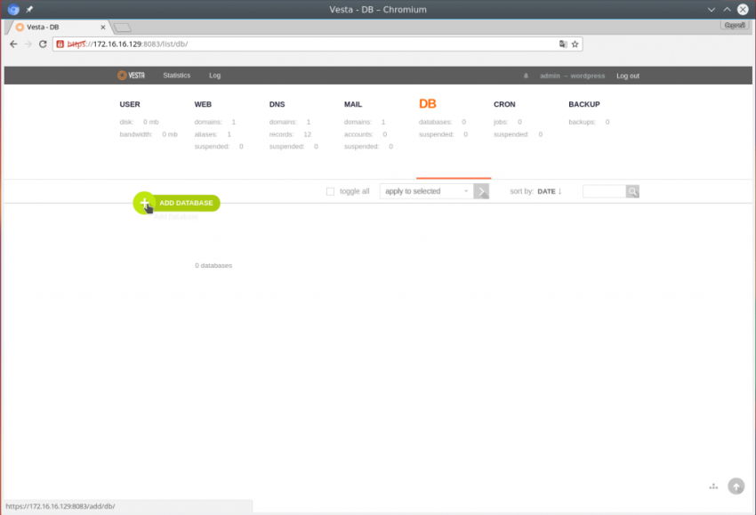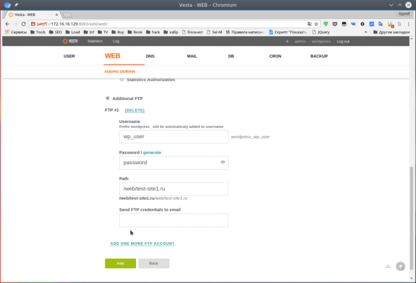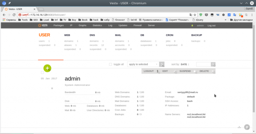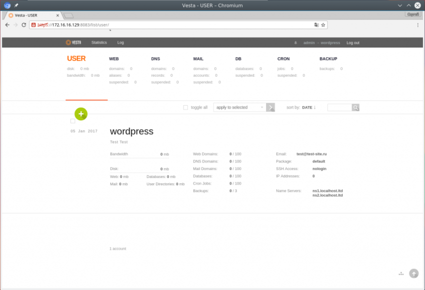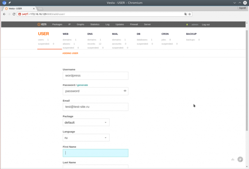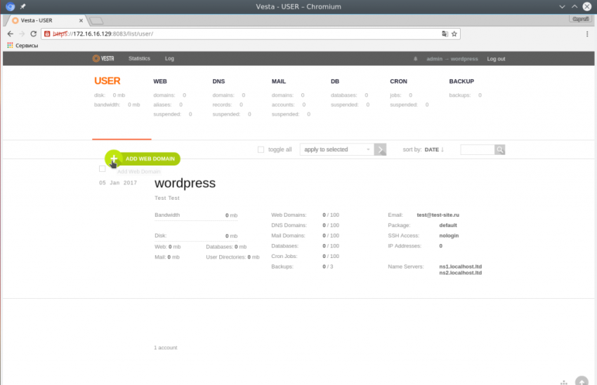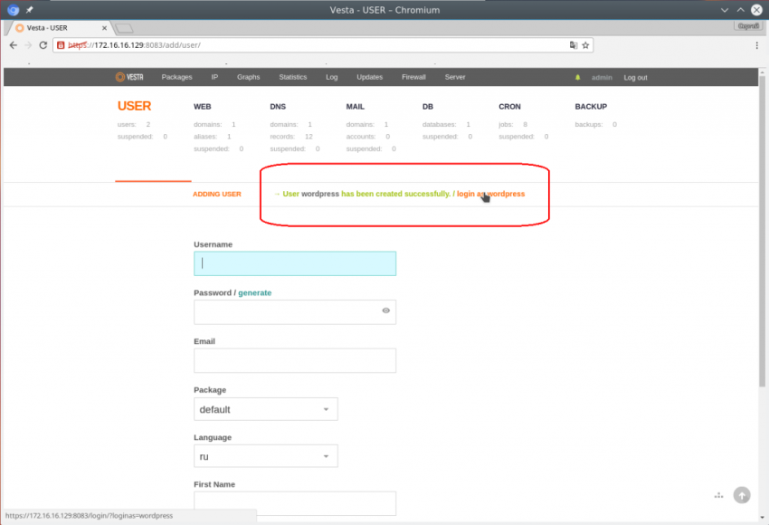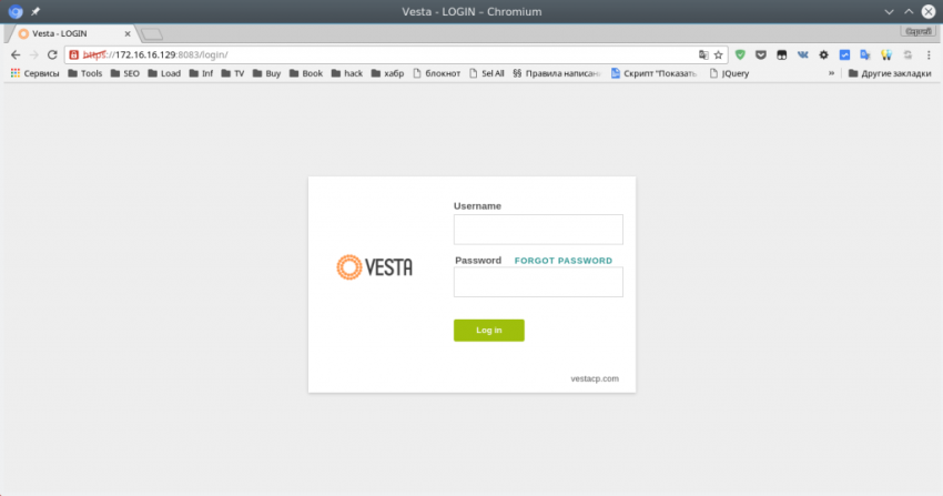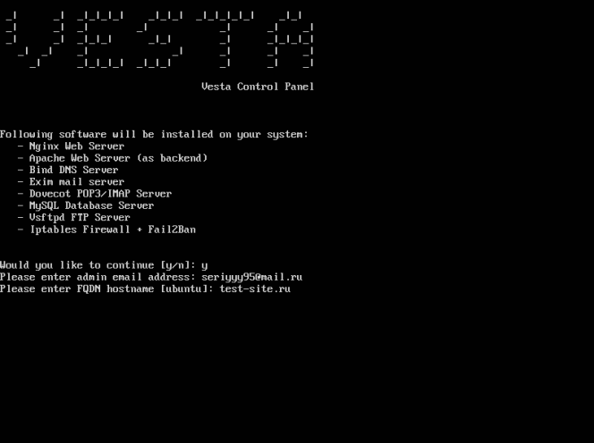 Установка VestaCP завершена, теперь перейдем к первоначальной настройке и созданию первого сайта, например, на движке WordPress.