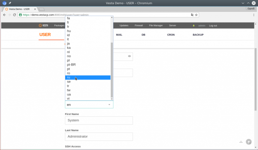 Вы можете открыть одну из вкладок и настроить там то, что вам нужно. Кроме того, для администратора доступно еще одно меню, где можно управлять установленными пакетами, настройками брандмауэра, и самой панели и многим другим.