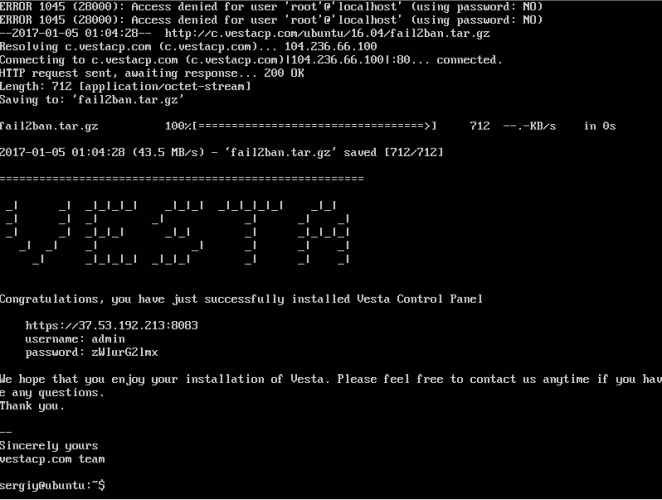Когда установка VestaCP Ubuntu будет завершена, панель сообщит об этом и выведет сообщение с возможным адресом доступа к панели: