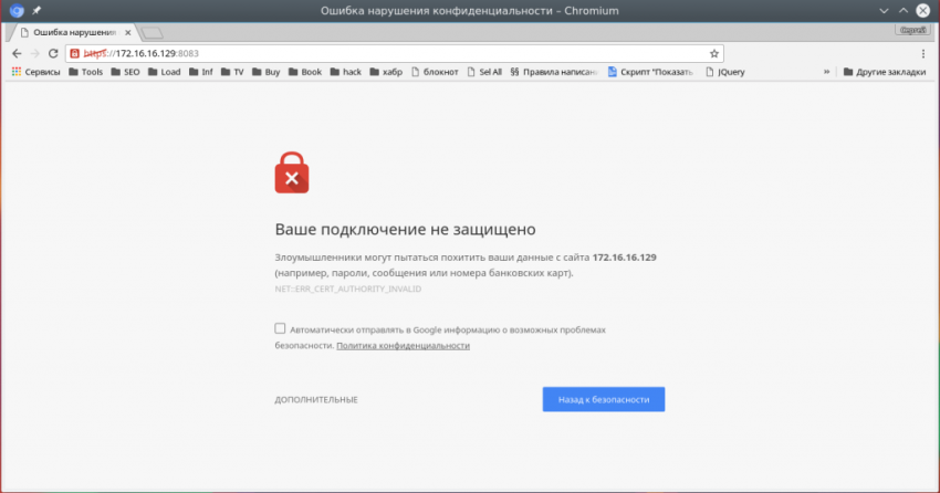 Панель VestaCP может быть доступна с помощью браузера. Откройте адрес, указанный в сообщении панели, например, 174.16.16.129:8083. Вы увидите предупреждение об недействительном сертификате. Это происходит потому, что VestaCP создала собственный сертификат, не подписанный ни одним из центров сертификации. Браузер не знает, стоит ли ему доверять. Но мы знаем, что это наш сертификат, поэтому откройте Дополнительно, затем Перейти на сайт: