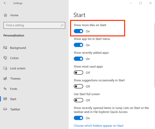 Нажмите или коснитесь его переключателя, чтобы активировать его, что позволит отображать больше плиток в меню «Пуск».