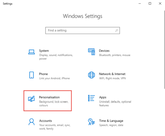 В приложении «Настройки» щелкните или нажмите раздел «Персонализация».
