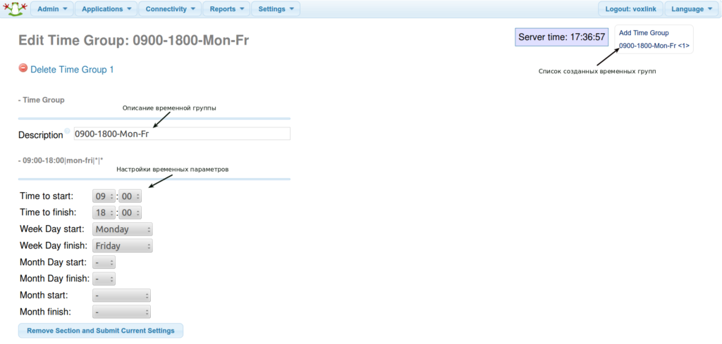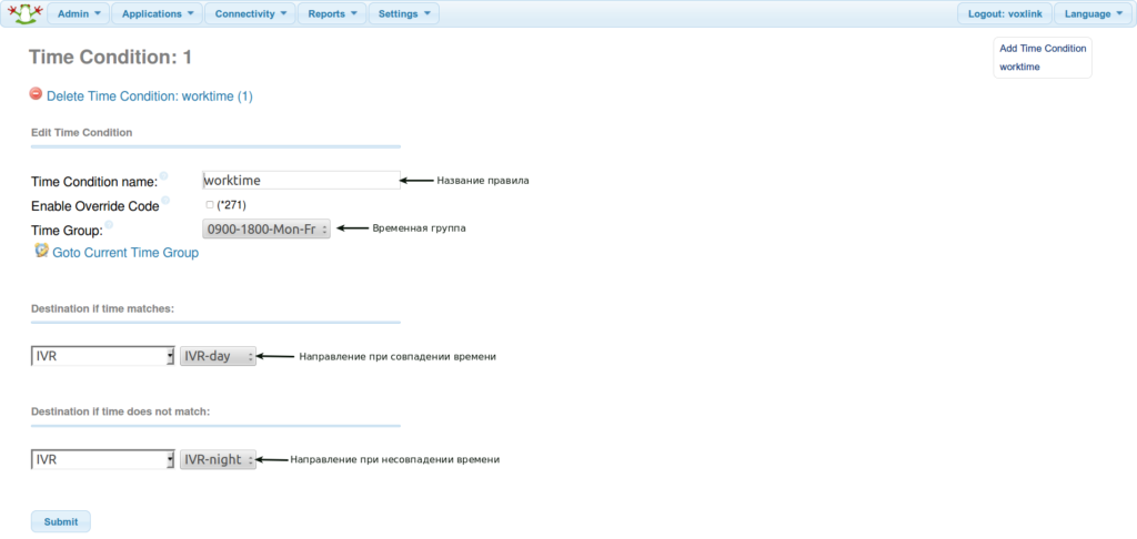 Теперь можно перейти на страницу создания Временных правил: Applications>Time Conditions. В поле Time Condition name задается имя правила, например, worktime. В поле Time Group выбирается созданная на предыдущем шаге временная группа. Поле Destination if time matches (Назначение если время совпадает) — соответственно выставляет назначение куда будет направлен входящий звонок при совпадении времени — в данном случае будет завернут в IVR-day. Поле Destination if time does not match (Назначение если время не совпадает) — соответственно выставляет назначение куда будет направлен входящий звонок при не совпадении времени — в данном случае будет завернут в IVR-night.