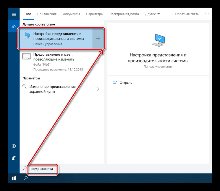 - Кликаем по лупе справа от «Пуска». В поле для поиска набираем слово «представление». По мере ввода должна сразу появиться выдача «Настройка представления и производительности системы». Щёлкаем по этому результату.