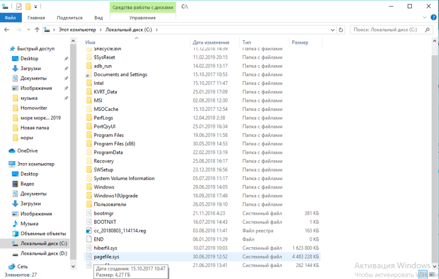 Виртуальная память в виде файла подкачки находится в корневой папке локального системного диска. По умолчанию эта память включена в «Виндовс». Но даже если она отключена, вы можете её сами включить в настройках системы — об этом в следующем разделе.