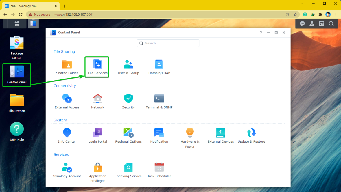 Чтобы включить файловую службу SFTP, нажмите «Файловые службы» в приложении «Панель управления».