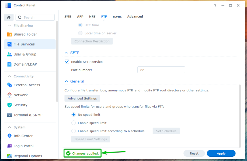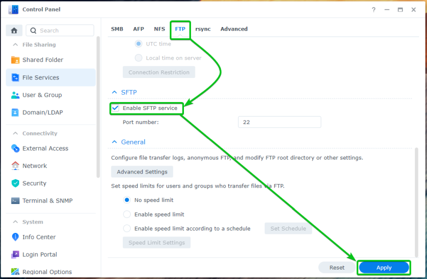 На вкладке FTP установите флажок «Включить службу SFTP» и нажмите «Применить».