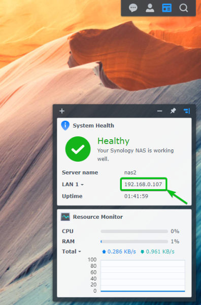 Вы можете найти IP-адрес своего Synology NAS в виджете «Состояние системы», как показано на снимке экрана ниже.