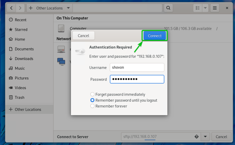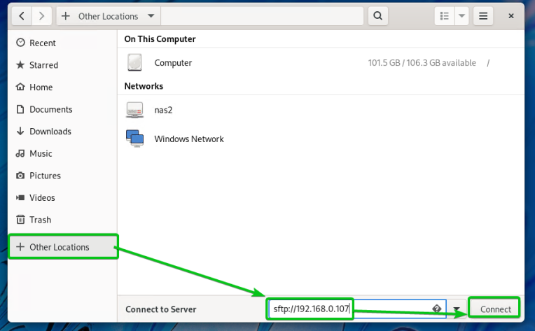 В Linux, если вы используете Nautilus, перейдите на вкладку «Другие местоположения», введите URL-адрес sftp://192.168.0.107 и нажмите «Подключиться», как показано на снимке экрана ниже.