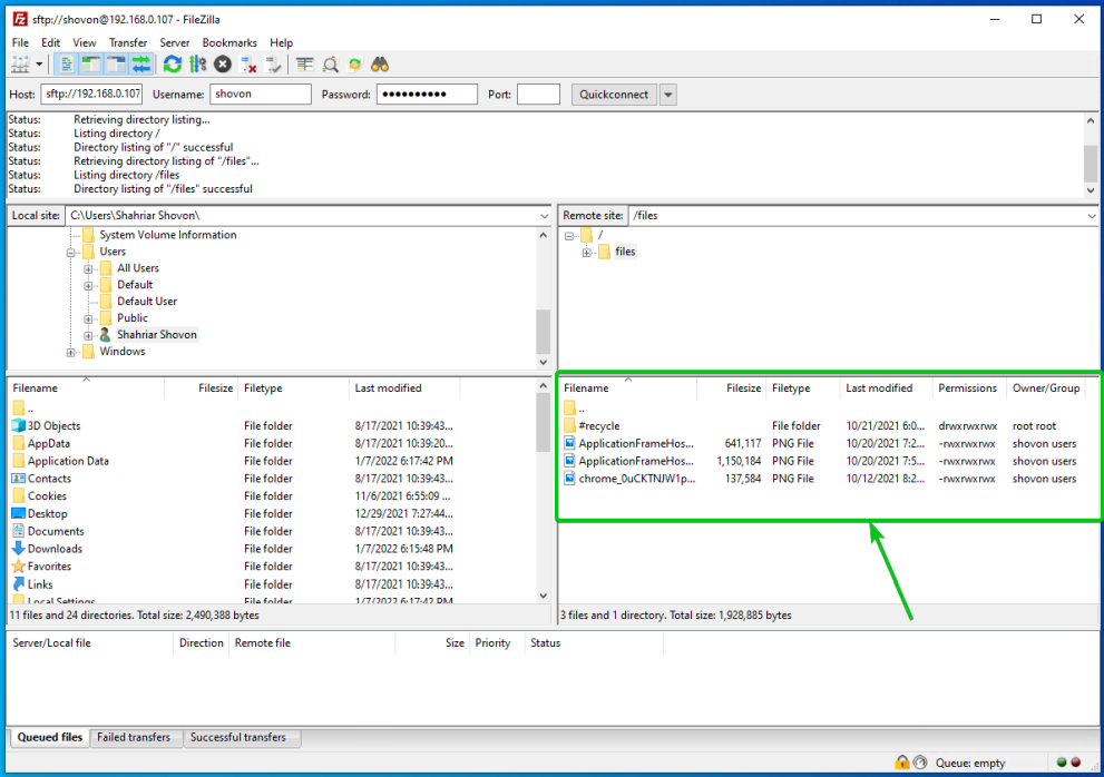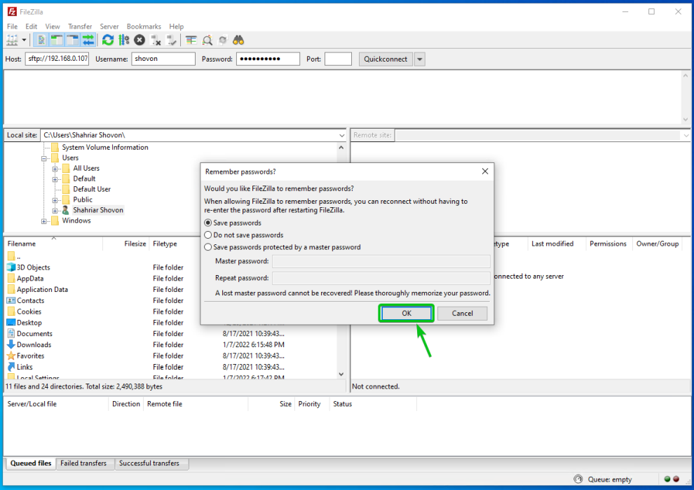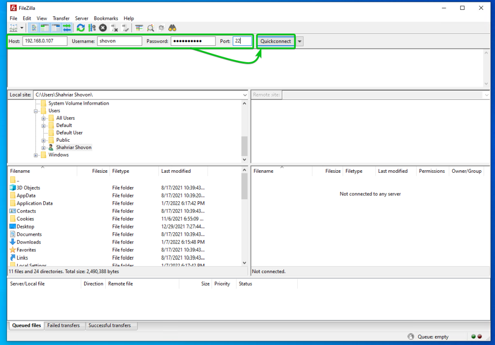 Чтобы получить доступ к общим папкам Synology NAS с помощью FileZilla, откройте FileZilla, введите IP-адрес Synology NAS в разделе «Хост», имя пользователя и пароль для входа в разделы «Имя пользователя» и «Пароль» соответственно, введите 22 в разделе «Порт» и нажмите Quickconnect, как показано на скриншоте ниже.