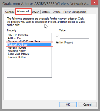 Затем нажмите или коснитесь вкладки «Дополнительно » и выберите свойство «Сетевой адрес» в списке «Свойства» . Если MAC-адрес был изменен, вы увидите пользовательское значение в поле «Значение» .