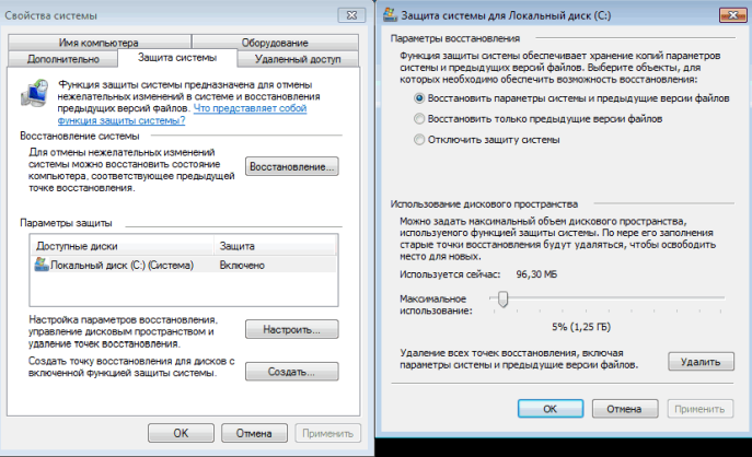 Защита системы предназначена для создания точек восстановления, которые используются для отката системных параметров. Личные файлы (за некоторым исключением) при этом не восстанавливаются. Тем не менее, точки восстановления и предыдущие версии файлов хранятся в одном месте – теневых копиях тома.