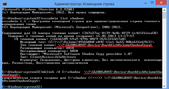 mklink /d С:shadow \?GLOBALROOTDeviceHarddiskVolumeShadowCopy1