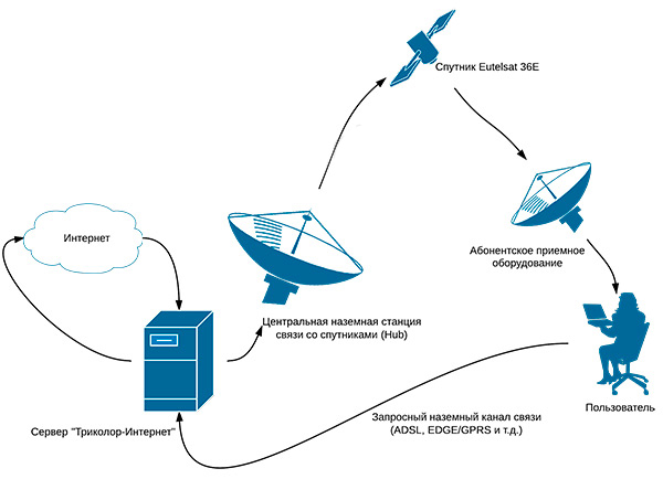 Спутниковый интернет от «Триколор ТВ» работает по принципу асинхронного или одностороннего доступа, по которому информация только поступает. Для запроса данных служат наземные каналы: GPRS, EDGE, 4G и др. Полностью схема работы выглядит так: