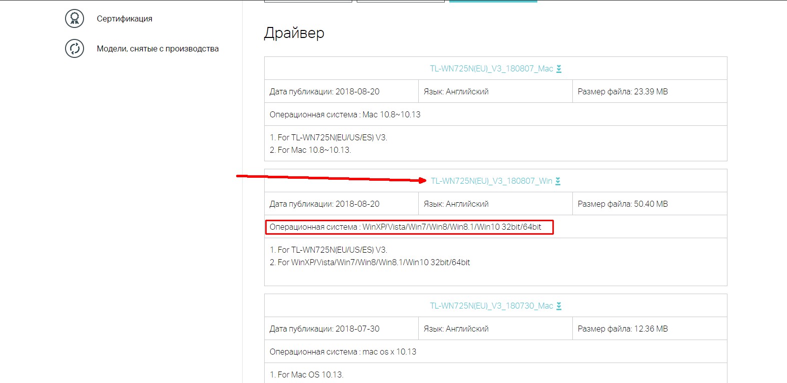 - Открываем страницу официального сайта TP-Link, посвящённую адаптеру TL-WN725N. В таблице «Драйвер» находим графу, в которой отмечена наша операционная система. Щёлкаем по ссылке над соответствующей графой и сохраняем файл на компьютере.