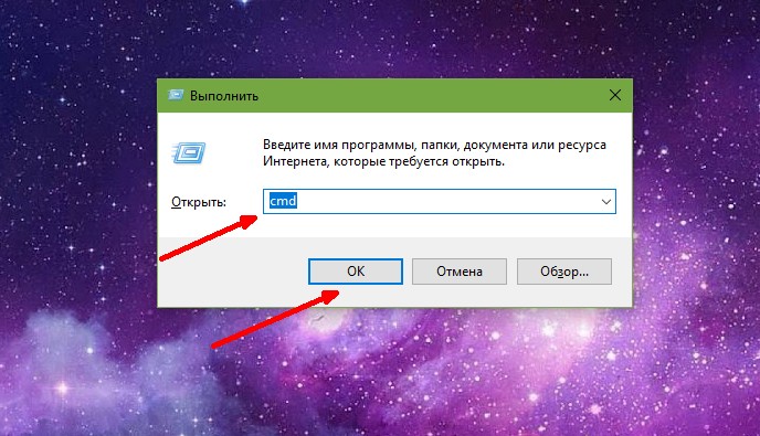 - Нажимаем комбинацию клавиш Wi+R, в поле «Открыть» прописываем CMD и нажимаем OK.