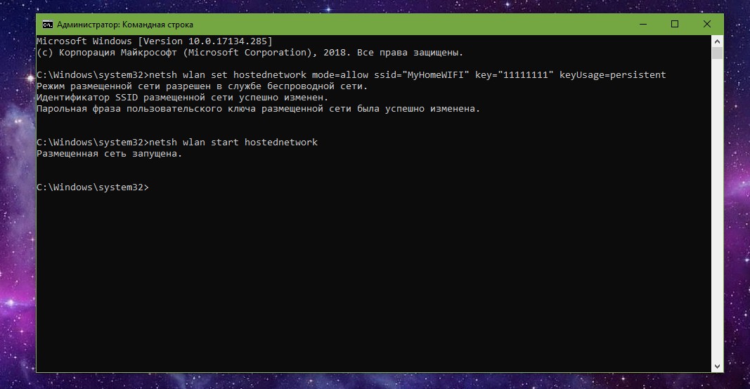 - netsh wlan set hostednetwork mode=allow ssid=«MyHomeWIFI» key=«11111111» keyUsage=persistent (параметр ssid задаёт имя сети, а key — приписывает ей пароль, который необходимо будет ввести при подключении, при этом пароль должен состоять ине менее чем из 8 символов);