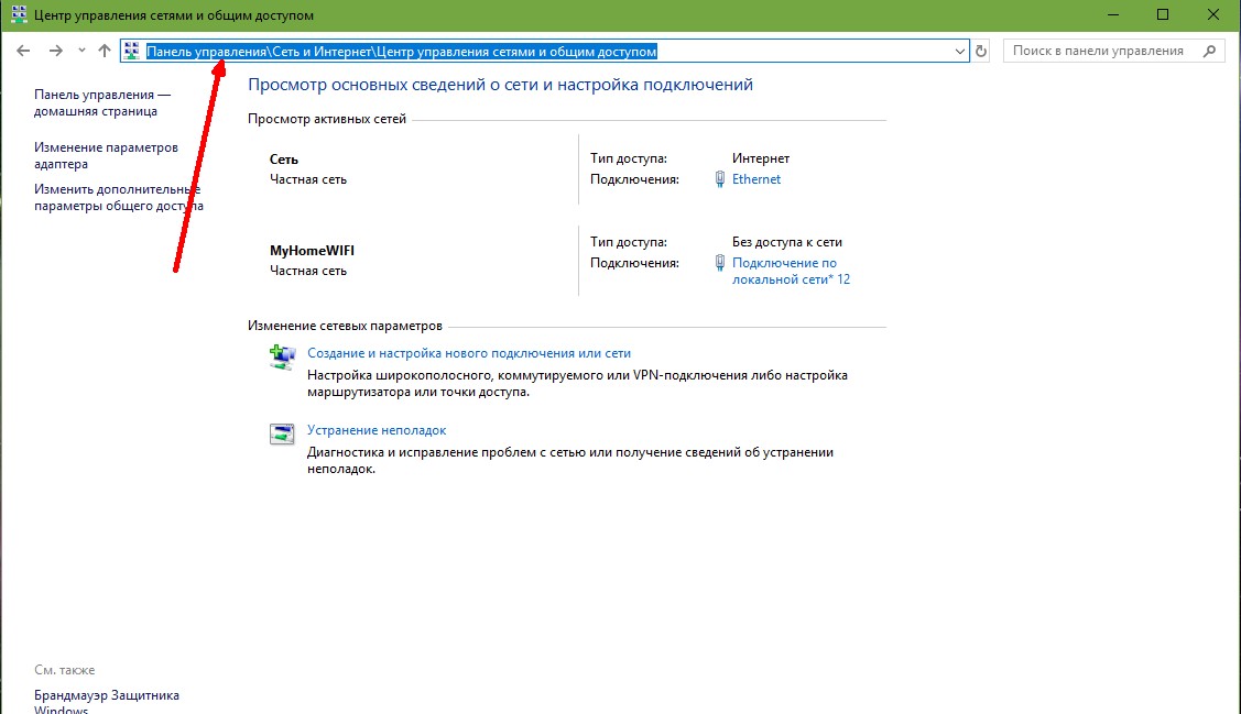 - Открываем проводник, в адресной строке прописываем «Панель управленияСеть и ИнтернетЦентр управления сетями и общим доступом» и нажимаем Enter.