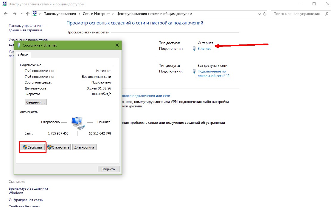 - Щёлкаем по подключению ПК к интернету и в открывшемся окне выбираем «Свойства».
