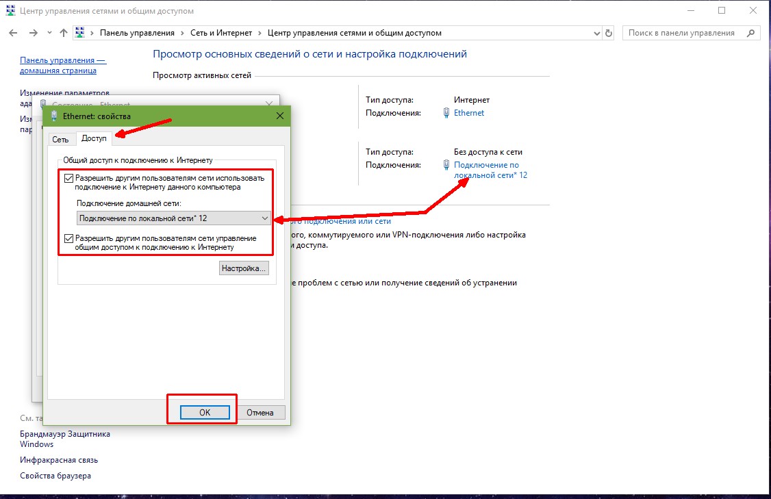 - Открываем вкладку «Доступ», ставим галочки у двух пунктов «Разрешить другим пользователям…», а в фильтре выбираем созданное подключение. Затем сохраняем изменения во всех окнах кнопкой OK.