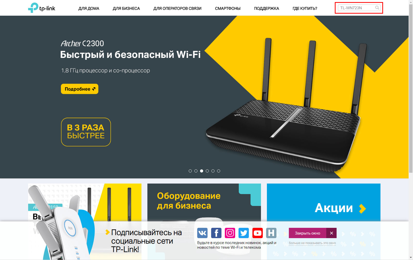 - При помощи интернет-браузера откройте сайт компании-производителя, в строке поиска в правом верхнем углу введите название адаптера.