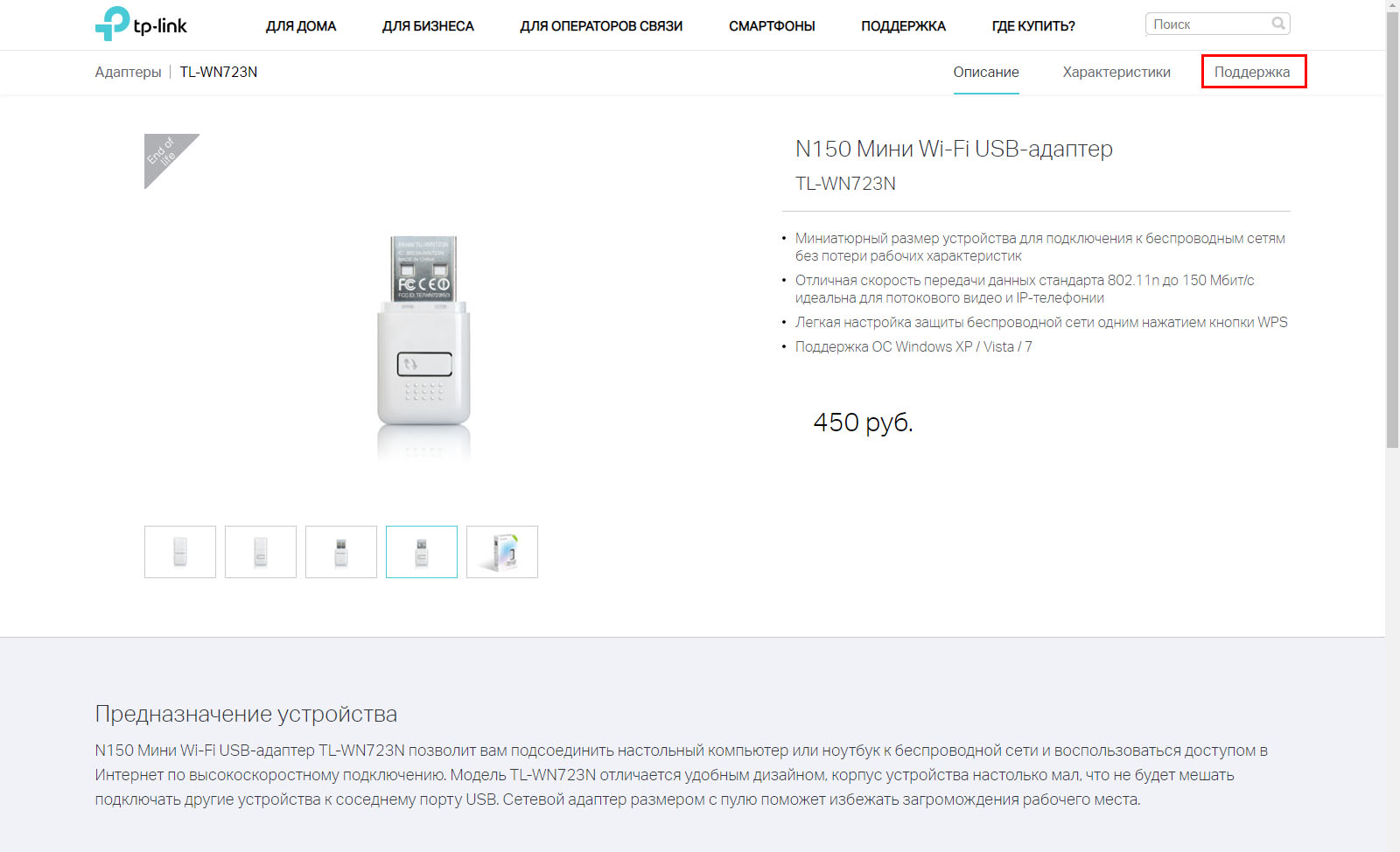 - Мини-сайт адаптера содержит фотографии, технические характеристики и архив файлов, необходимых для работы устройства. Чтобы открыть его, перейдите в раздел «Поддержка».