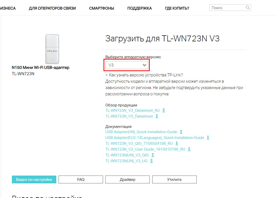 - Поскольку адаптер выпускался в нескольких вариантах, уточните его аппаратную версию на упаковке и введите её в поле выбора на странице.
