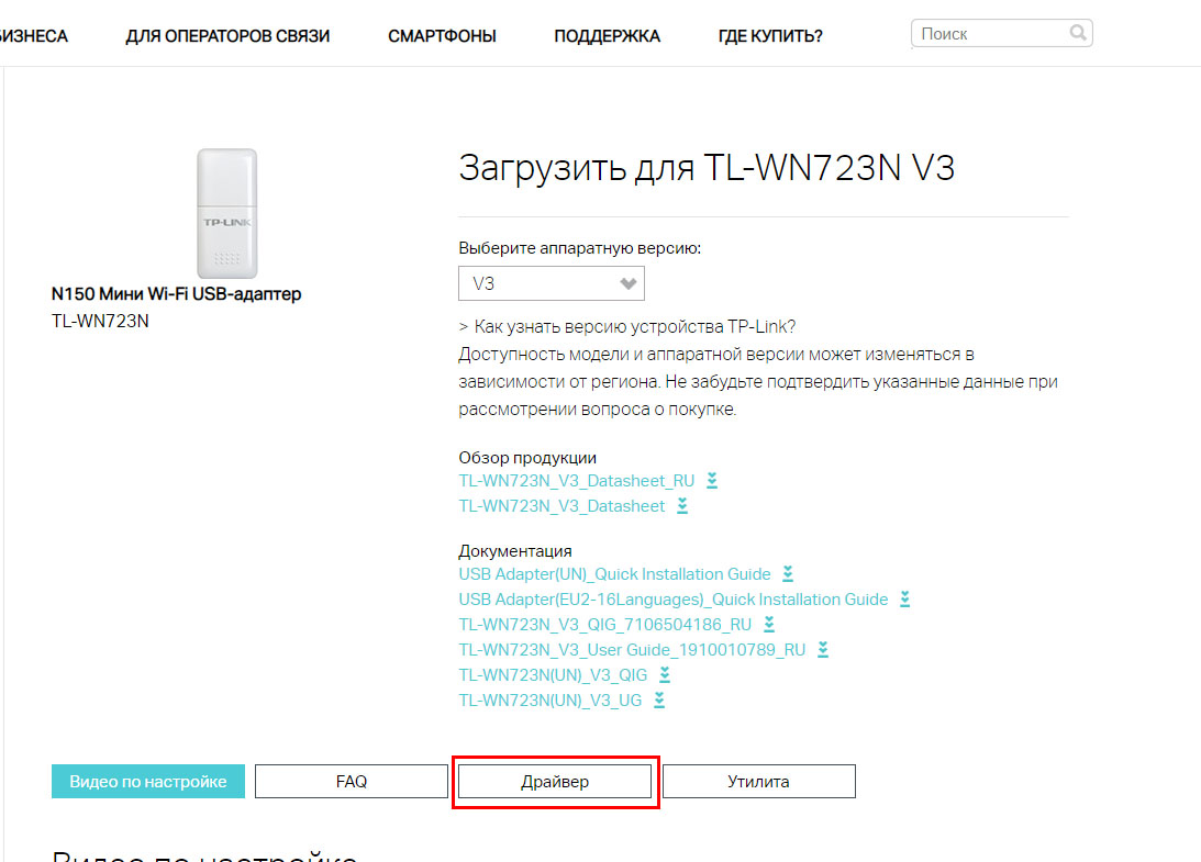 - Нажмите кнопку «Драйвер», чтобы перейти в раздел программного обеспечения адаптера. Рекомендуем помимо драйверов загрузить также онлайн-документацию, которая на сайте более подробная, чем на идущем в комплекте компакт-диске.