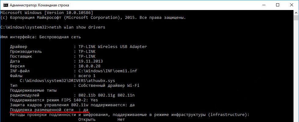 - Введите в окне интерпретатора команд строку «netsh wlan show drivers» и убедитесь, что программное обеспечение вашего беспроводного адаптера поддерживает работу в режиме программной точки доступа. В системном отчёте пункт «поддержка размещённой сети» (вторая строка снизу) должен быть «да». Если данные отчёта говорят о том, что размещённая сеть не поддерживается — попробуйте обновить ПО адаптера или переподключить TL-WN723N в другой порт USB.