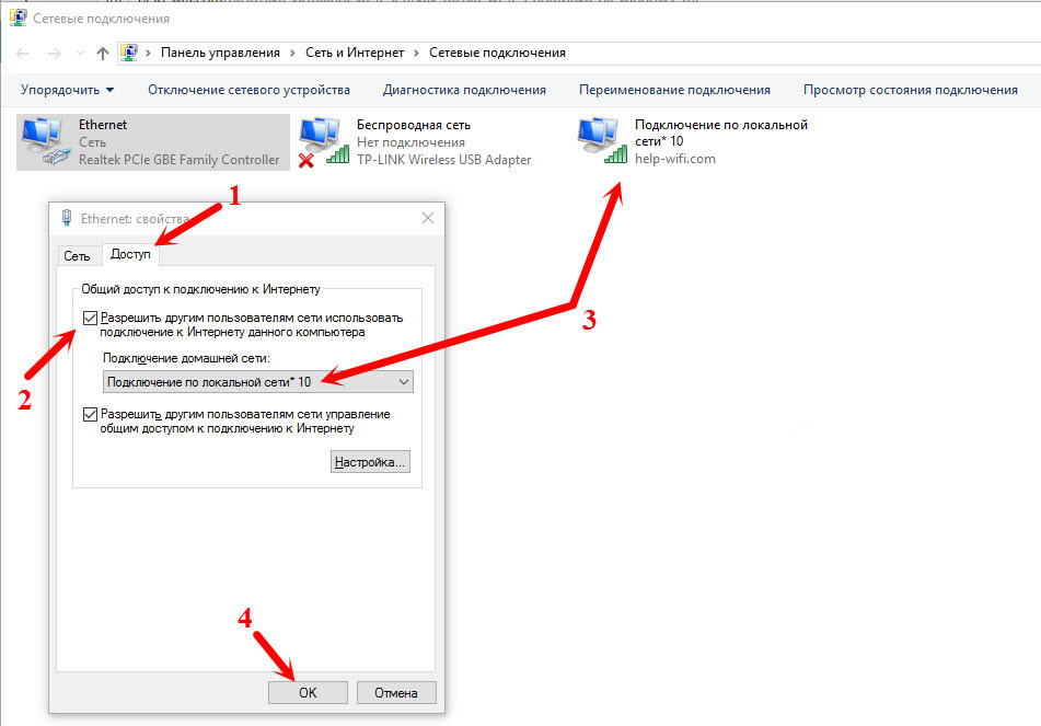 - В окне свойств перейдите на вкладку доступ и включите обе галочки в блоке «общий доступ подключения к интернету». И выпадающего списка «подключение домашней сети» выберите ту беспроводную сеть, которая была создана и запущена несколькими шагами выше.