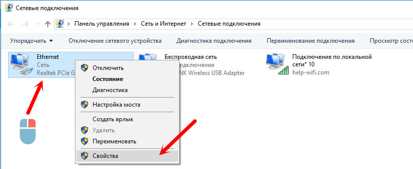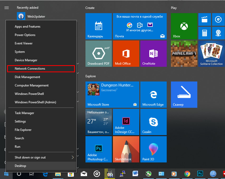 - Откройте окно доступных сетевых подключений (вызывается из меню «Пуск» при помощи правой кнопки мыши).