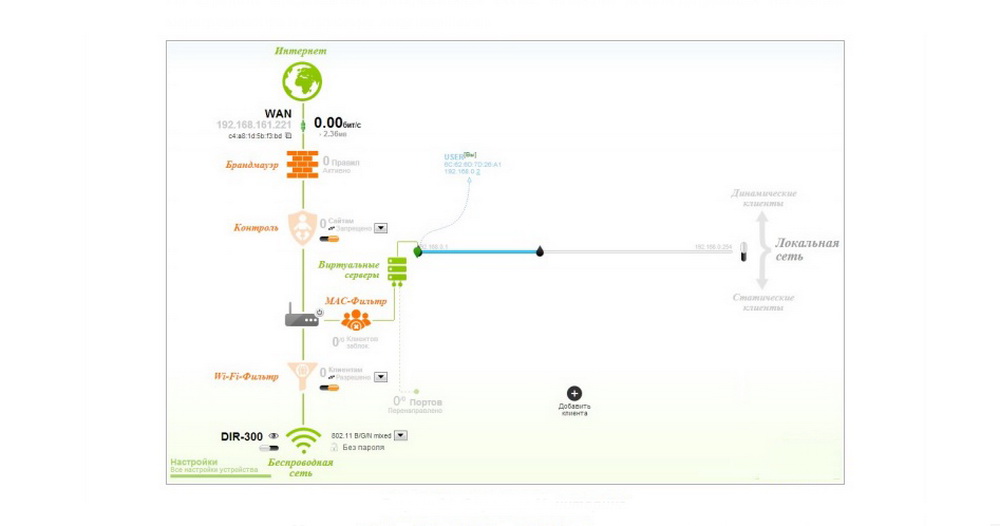 На странице мониторинга представлена интерактивная схема, наглядно демонстрирующая настройки маршрутизатора и структуру локальной сети
