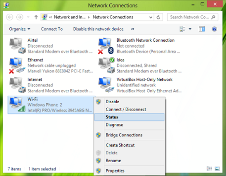 2. В окне «Сетевые подключения» щелкните правой кнопкой мыши по Wi-Fi и выберите «Состояние».