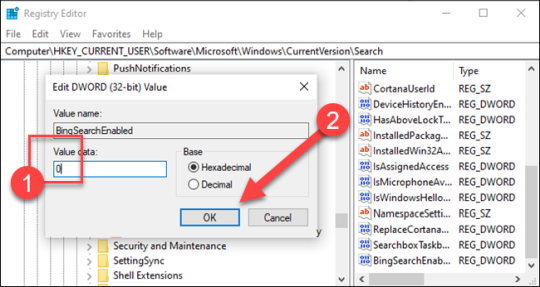 Дважды щелкните новое значение BingSearchEnabled чтобы открыть диалоговое окно его свойств. Число в поле «Значение данных» уже должно быть 0 — просто убедитесь, что оно по-прежнему равно 0. Нажмите OK, чтобы продолжить.