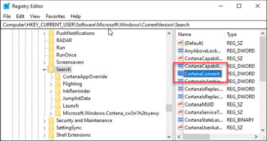 Если вы не видите CortanaConsent, создайте его, выполнив те же действия, которые вы использовали для создания BingSearchEnabled.