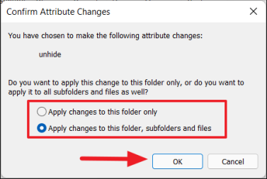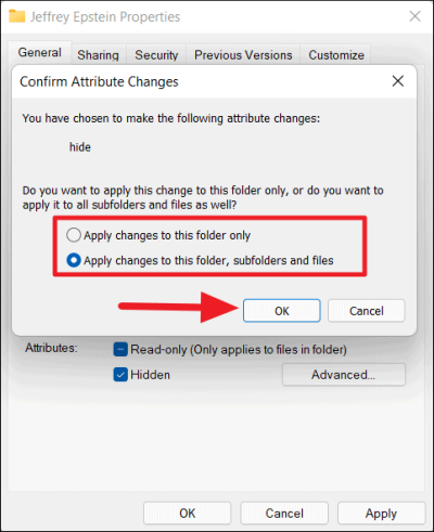 Когда вы нажимаете кнопку «Применить», вас спросят, скрываете ли вы только выбранную папку или все подпапки и файлы, содержащиеся в этой папке. Если вы скрываете папку со всеми файлами и подпапками, выберите параметр «Применить изменения к этой папке, подпапкам и файлам» и нажмите «ОК». Если вы скрываете только папку, но не ее содержимое, выберите «Применить изменения только к этой папке».