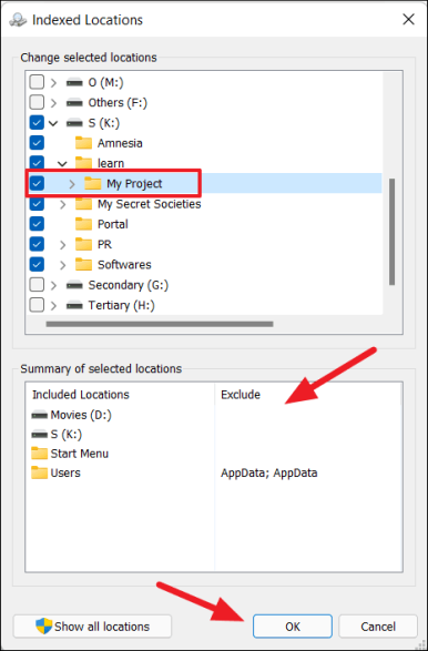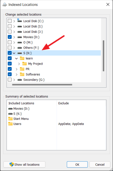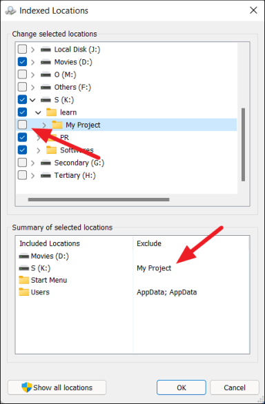 Это откроет еще одно диалоговое окно «Индексированное местоположение». Здесь все выбранные папки и диски включены в индекс. И все невыделенные папки и диски исключаются из индекса. Чтобы скрыть папку, необходимо исключить ее из индекса. Вы можете дважды щелкнуть диск или стрелку рядом с именем диска, чтобы просмотреть древовидный список папок.