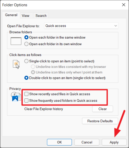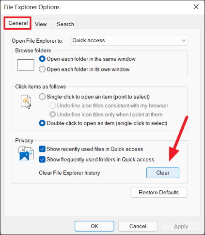 На вкладке «Общие» параметров проводника нажмите кнопку «Очистить» в разделе «Конфиденциальность». Затем нажмите «ОК», чтобы закрыть параметры папки.