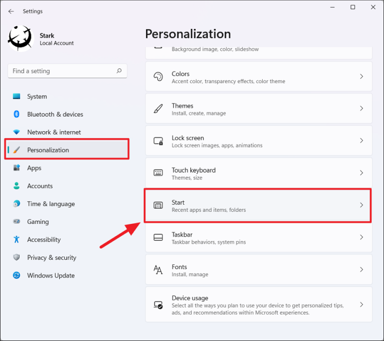 В приложении «Настройки» нажмите «Персонализация» на левой панели и выберите опцию «Пуск» справа.