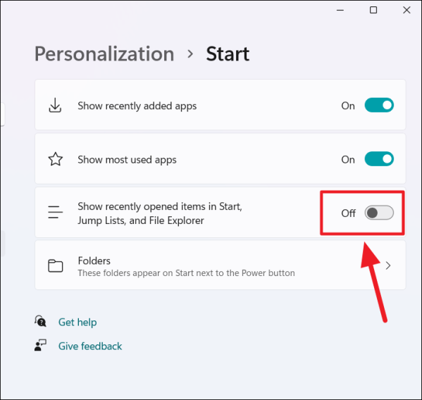 На странице настроек «Пуск» отключите переключатель рядом с «Показывать недавно открытые элементы в меню«Пуск», списках переходов и проводнике».