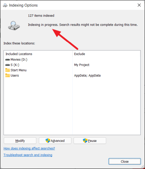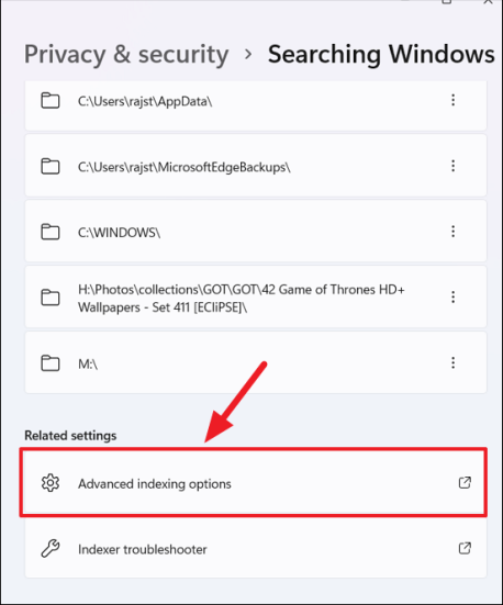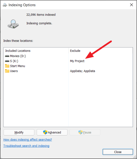 Скрыть файлы и папки из поиска Windows 11 с помощью параметров индексирования