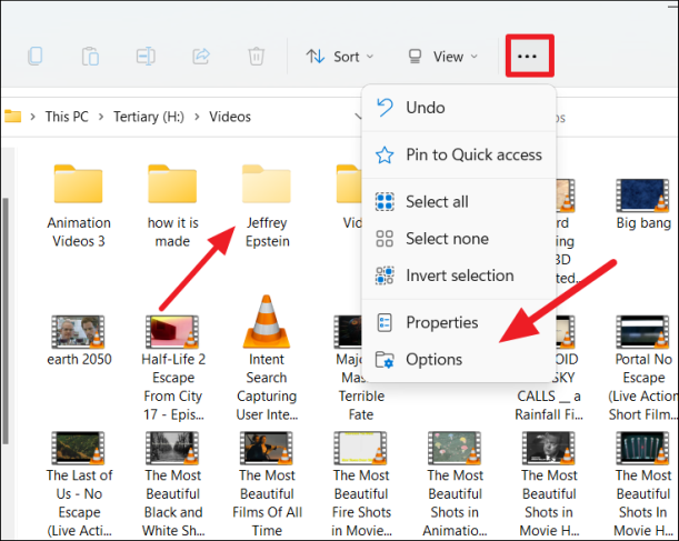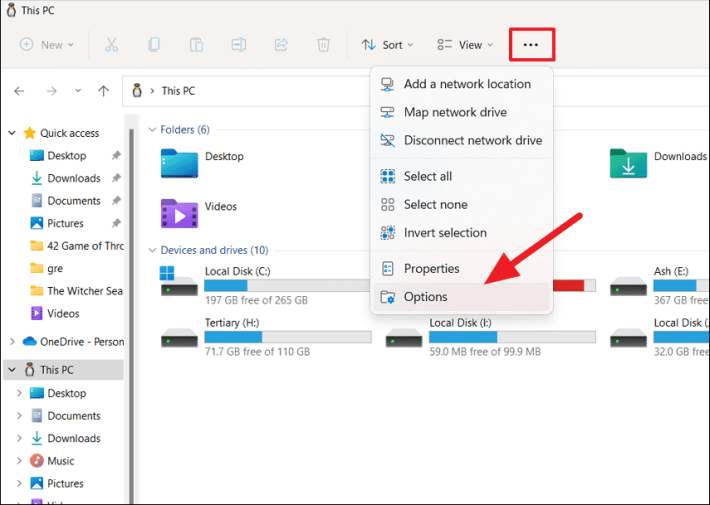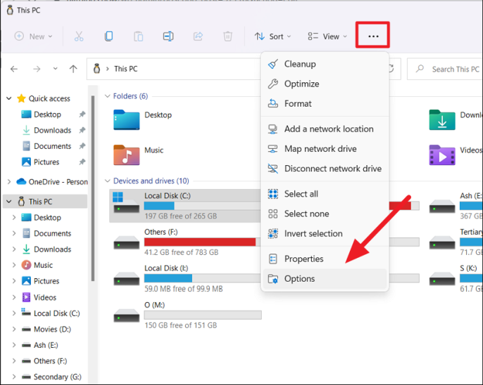 Щелкните значок проводника на панели задач или нажмите Windows+ E на клавиатуре, чтобы запустить проводник. Когда откроется проводник, нажмите кнопку «Горизонтальные три точки» (см. Подробнее) вверху и выберите «Параметры».