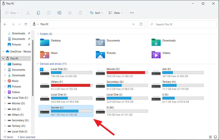Когда вы снова откроете проводник, вы увидите, что диск (Секреты) не отображается.