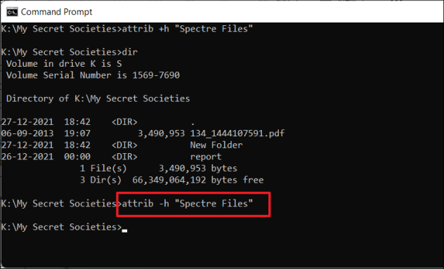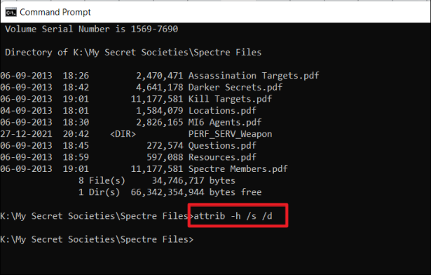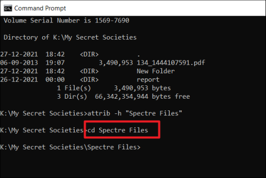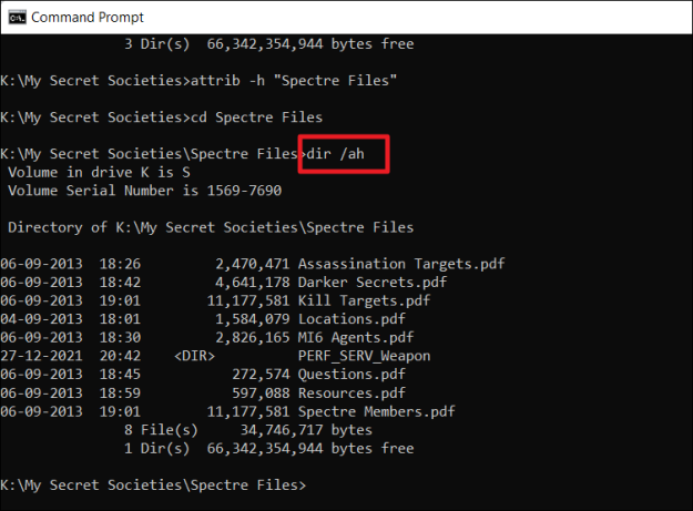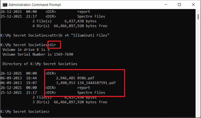 После того, как вы выполните указанную выше команду, она скрывает этот конкретный файл или папку. Как вы можете видеть, когда мы dirснова запускаем команду для проверки содержимого каталога, эта папка (Illuminati Files) недоступна, поэтому она скрыта.
