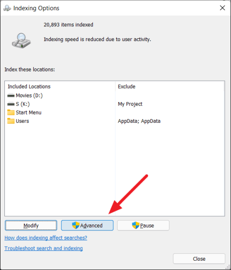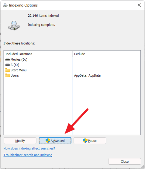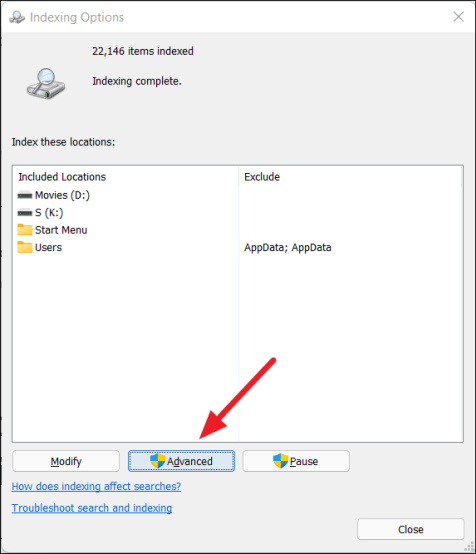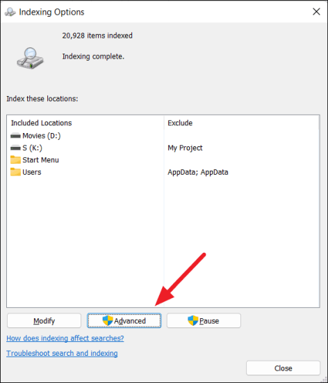 Когда откроется окно «Параметры индексирования», нажмите кнопку «Дополнительно» внизу.