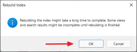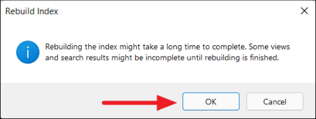 Затем нажмите кнопку «ОК» в окне подтверждения, чтобы перестроить индекс. Однако процесс займет некоторое время, чтобы его завершить.