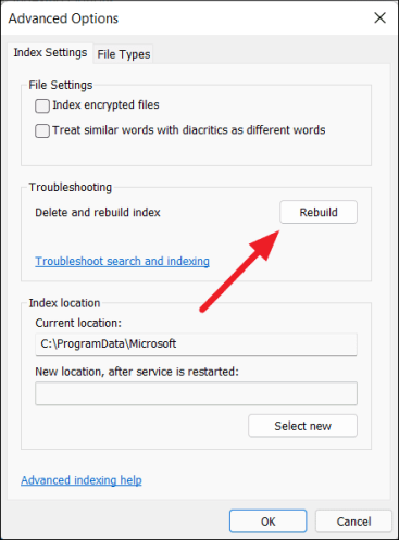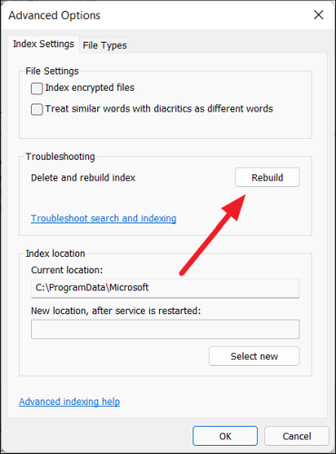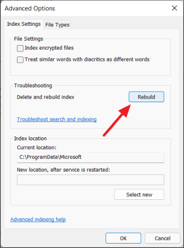 Затем нажмите кнопку «Перестроить» в диалоговом окне «Дополнительные параметры», чтобы перестроить индекс.
