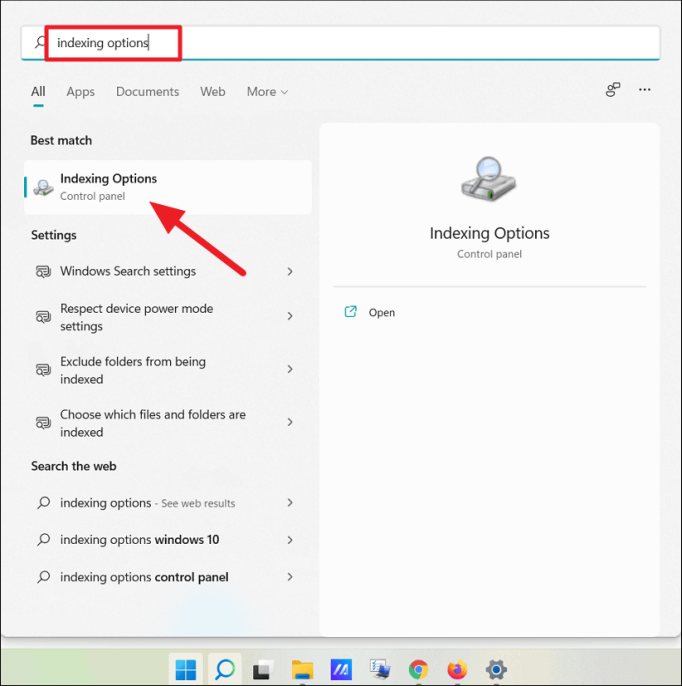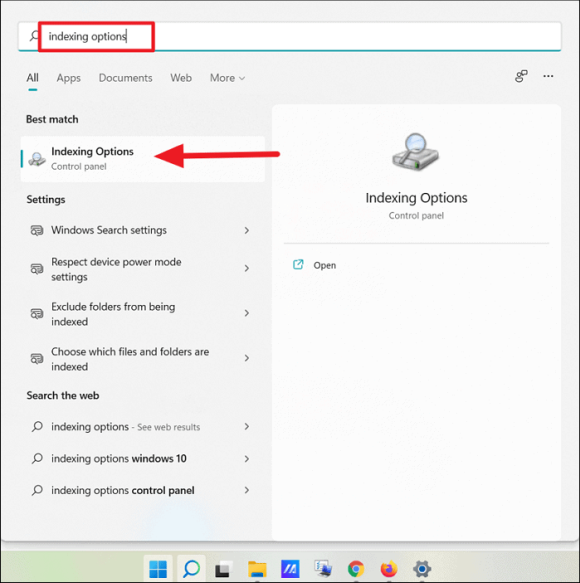 Откройте меню «Пуск», выполните поиск «Параметры индексирования» в поиске Windows и щелкните первый результат, чтобы открыть диалоговое окно «Параметры индексирования».