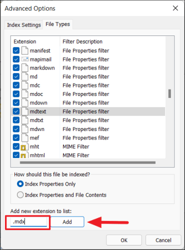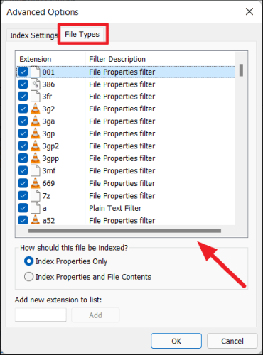 В окне «Дополнительные параметры» перейдите на вкладку «Типы файлов». Здесь вы можете увидеть список всех расширений файлов, поддерживаемых Windows, которые будут отображаться в поиске Windows.